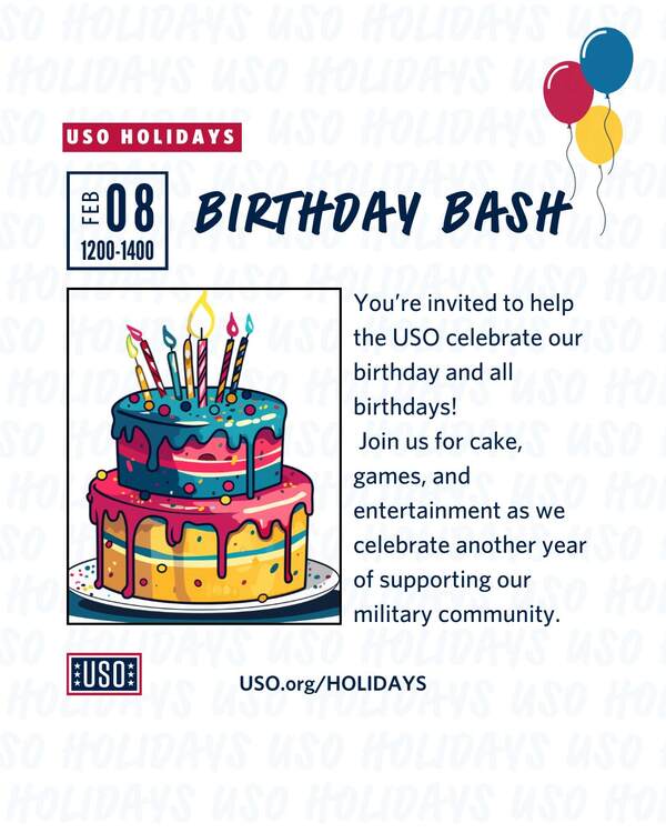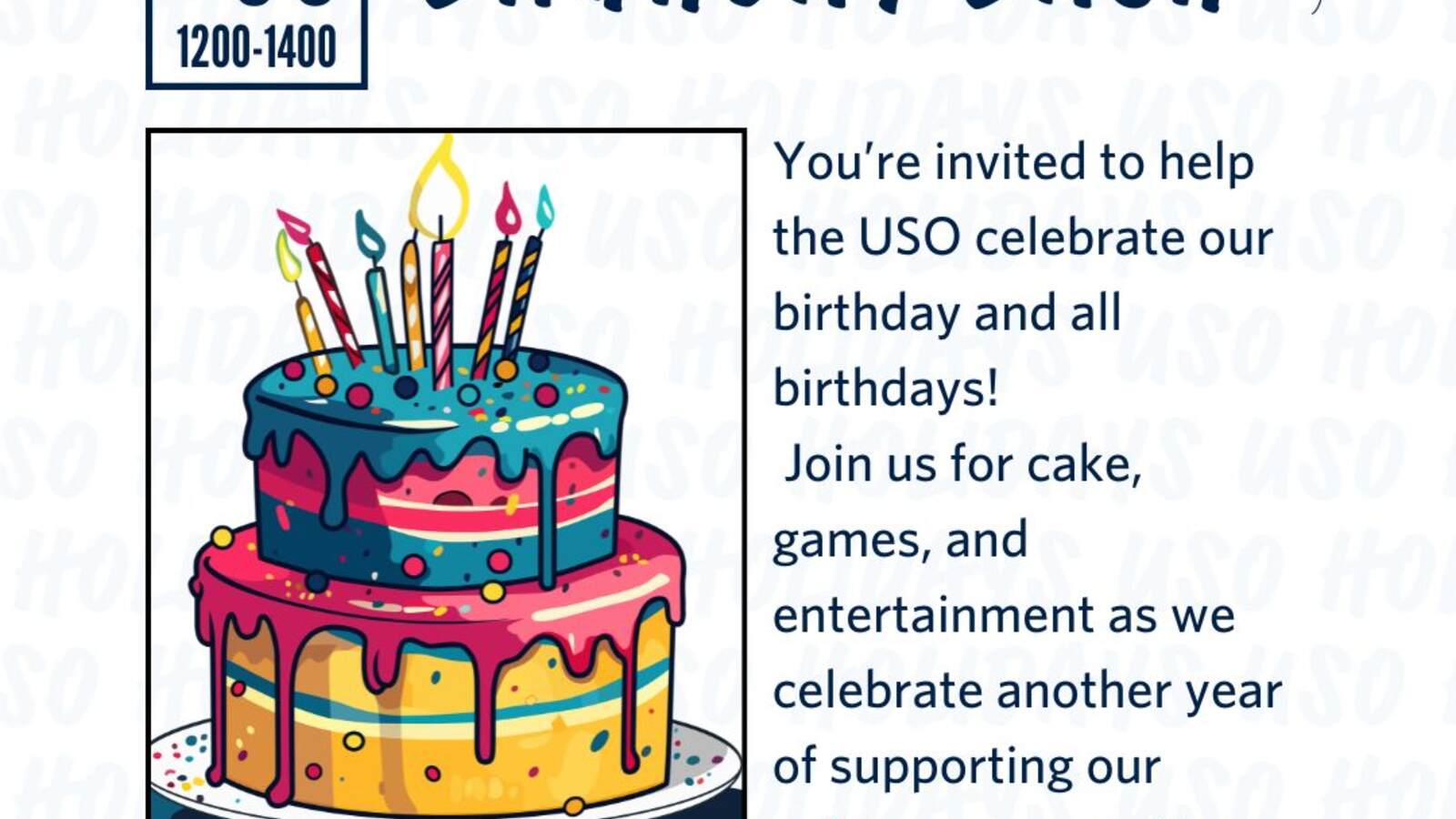 You’re invited to help the USO celebrate our birthday and all birthdays! Join us for cake, games, and entertainment as we celebrate another year of supporting our military community. Come ready for sweet treats, fun activities, and a whole lot of birthday cheer! Open to currently serving military and their families. Please register all members in your party. More details to come!